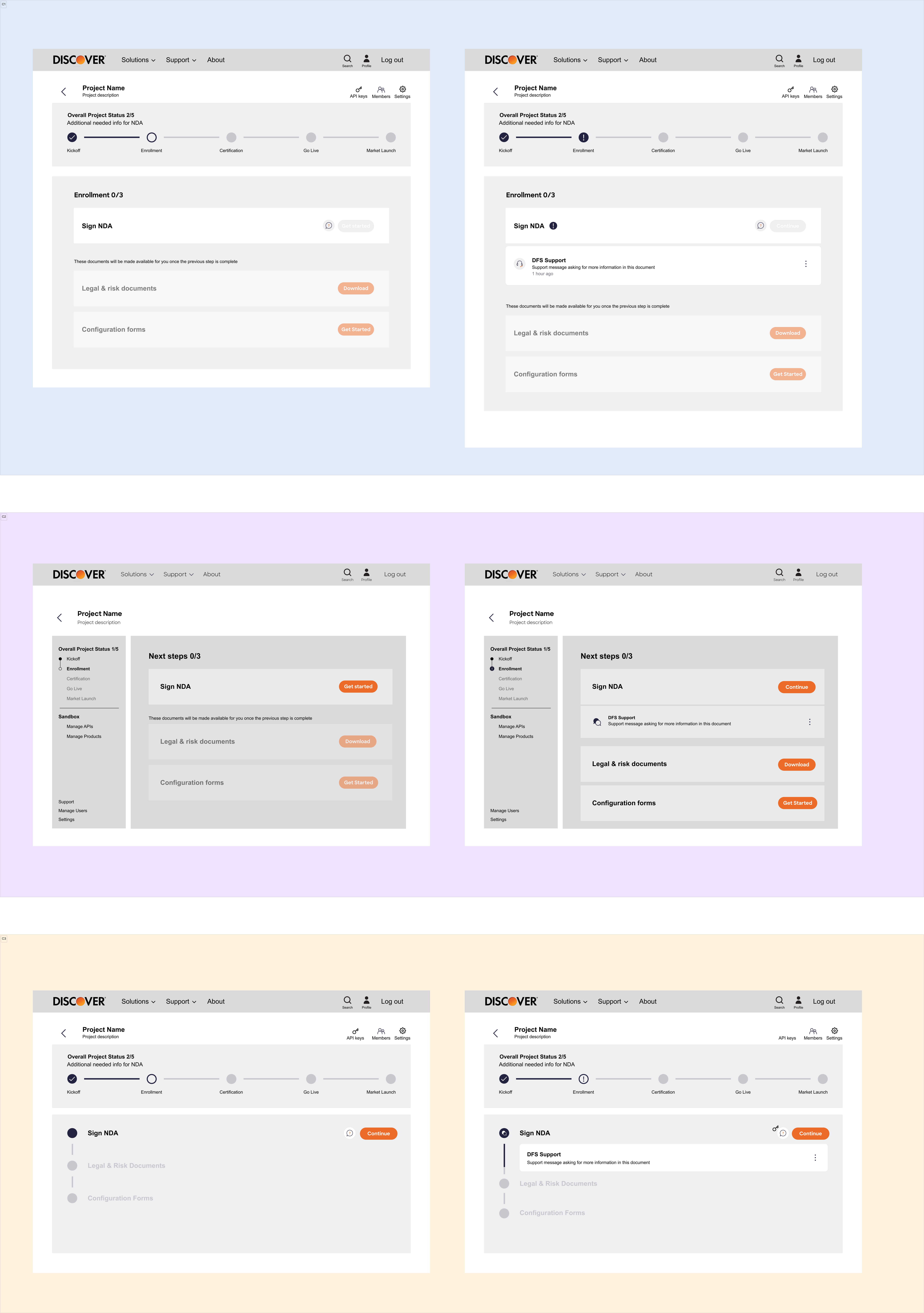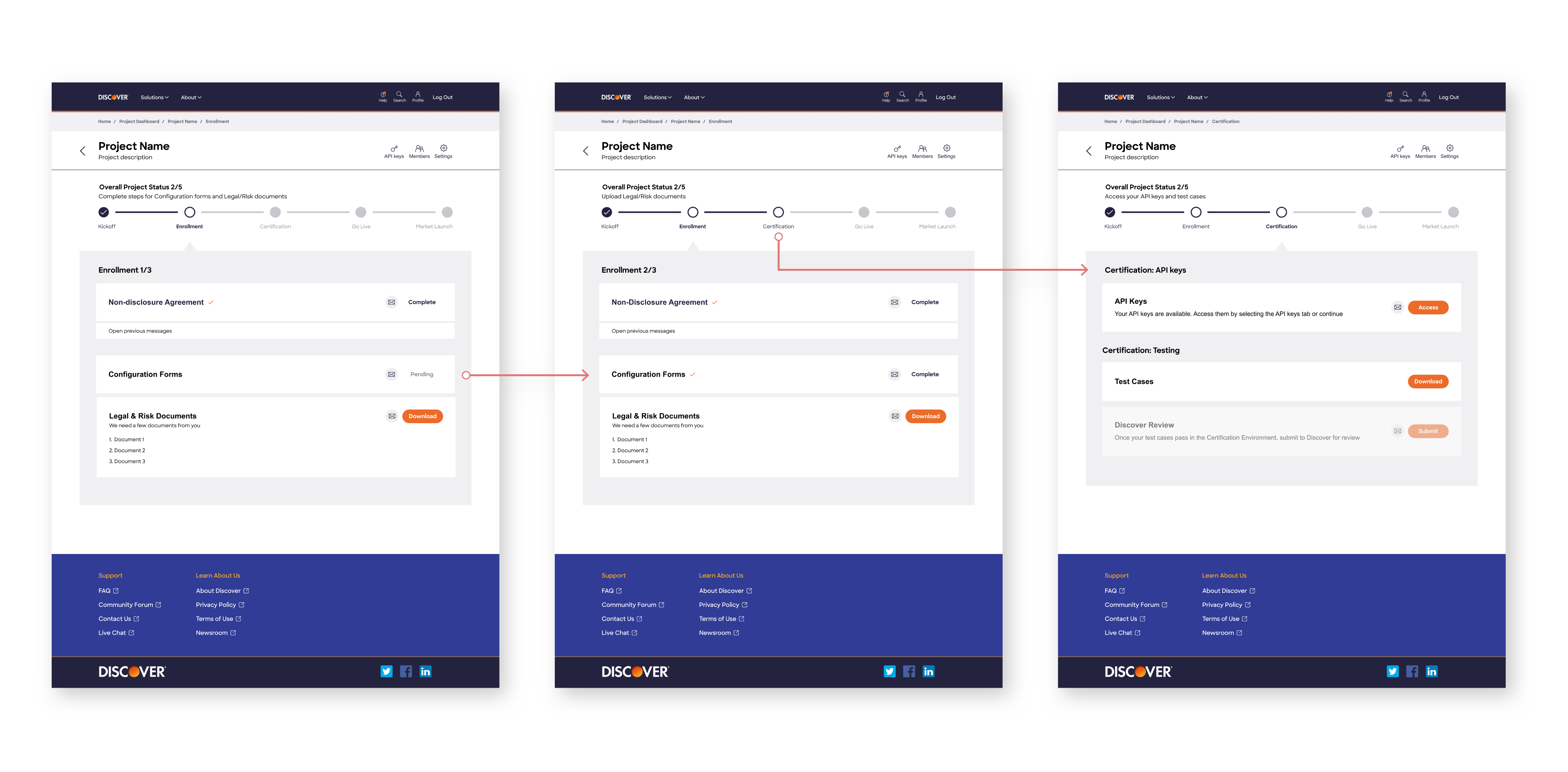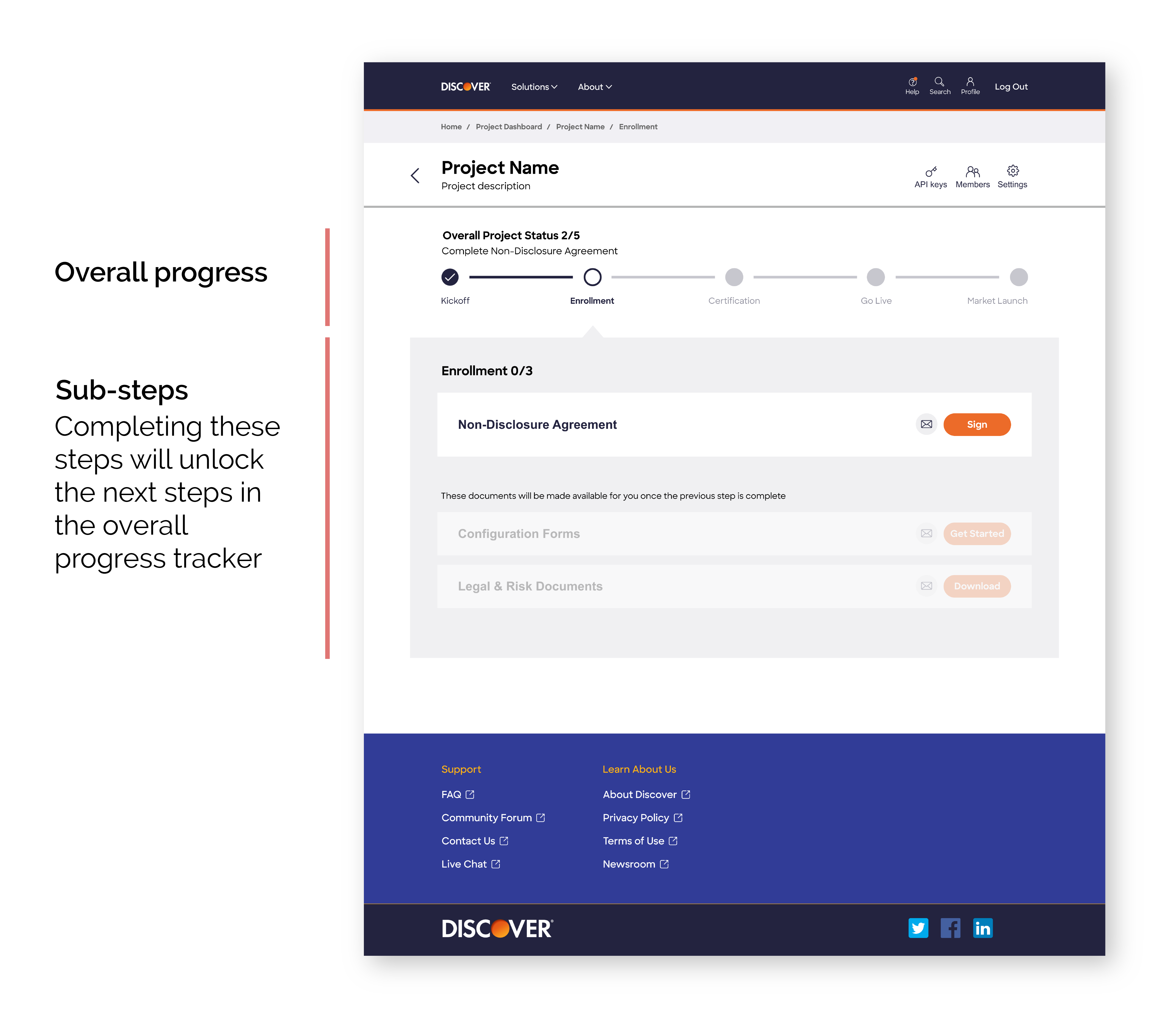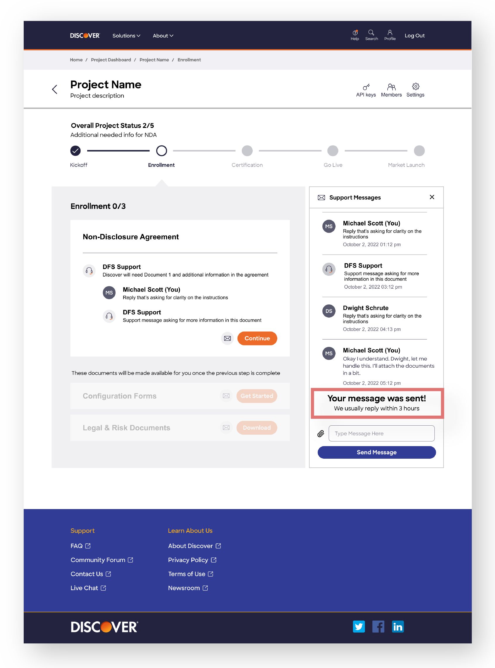 Here, I ensure that users are supported every step of the process. They could either message Discover themselves, or if there’s a problem, Discover’s message will appear at the step in progress.